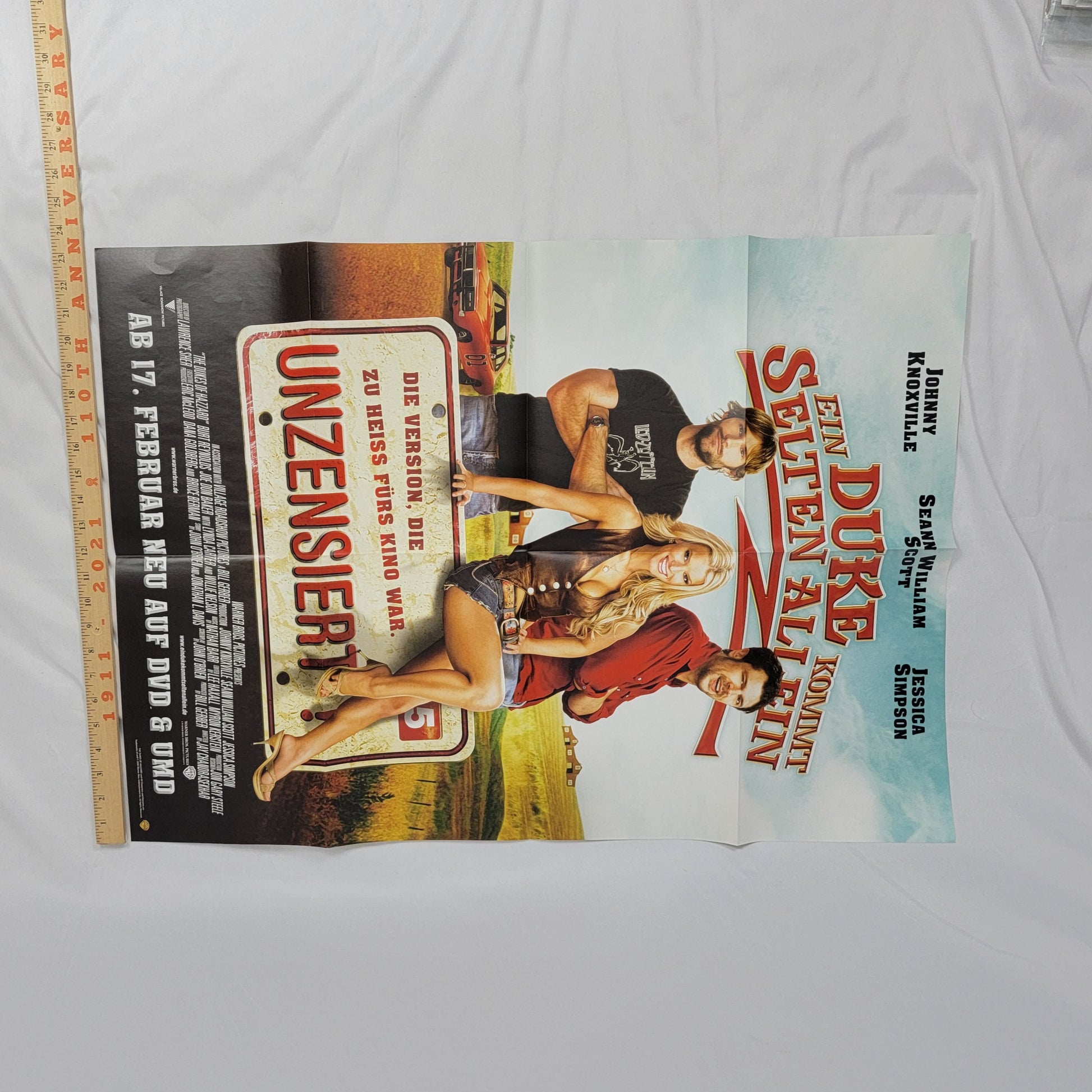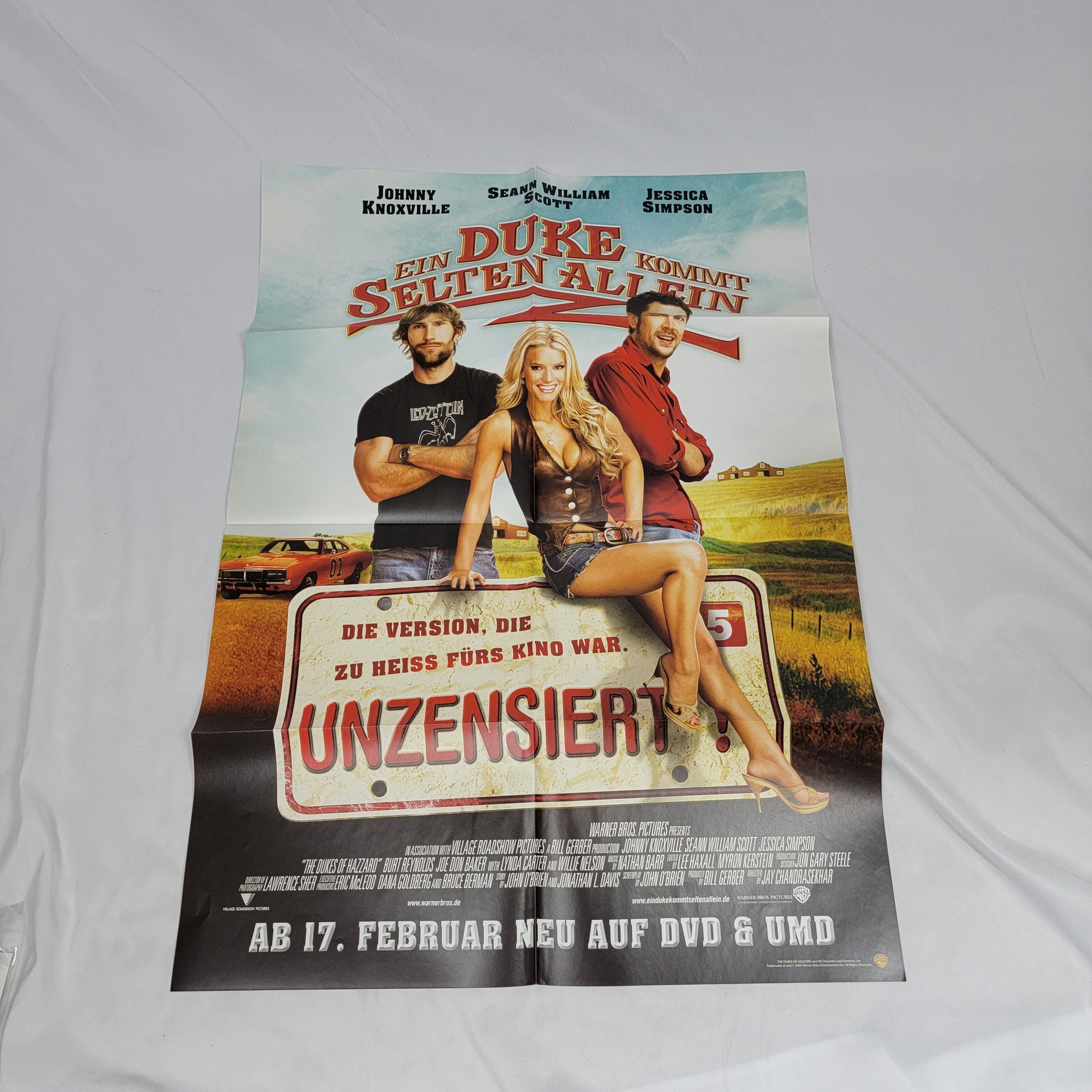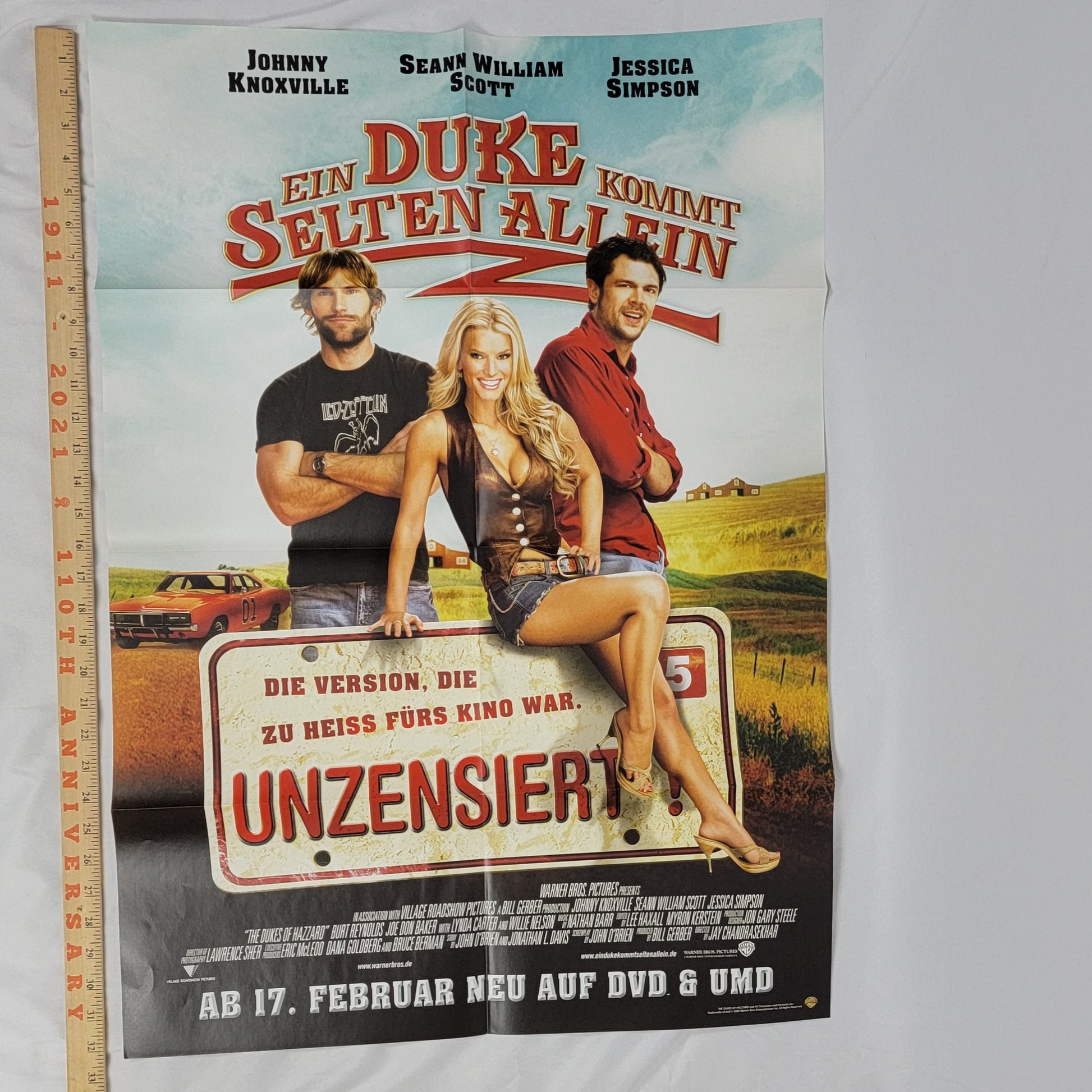 GERMAN Dukes Of Hazzard Movie Poster, announcing release on DVD. Poster of the 2005 Dukes Of Hazzard movie announcing the release of the movie on DVD in February 2006. Poster is dated 2006, and distributed by Warner Bros. EIN DUKE KOMMT SELTEN ALLEIN (A Duke Seldom Comes Alone). This movie poster (32 1/4 inch x 23 1/4 inch) comes folded as shown, as most movie studio posters are folded and shipped to europe this way.